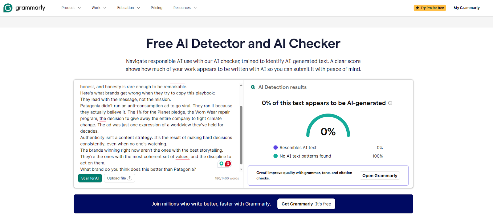 Grammarly's AI detector is embedded in a platform that many marketing writers already use daily for editing and proofreading. The main advantage is proximity: detection happens in the same environment as the rest of the writing review, without adding a separate tool or workflow step.