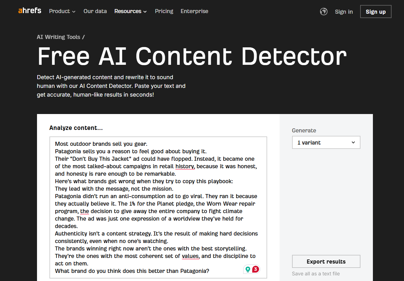 Ahrefs built their detector as part of a suite that also includes SEO and content quality tools. For marketing teams that already use Ahrefs to assess content performance, having AI detection in the same platform makes sense. The tool is oriented toward web content, which is where brand voice issues tend to show up most visibly in marketing.