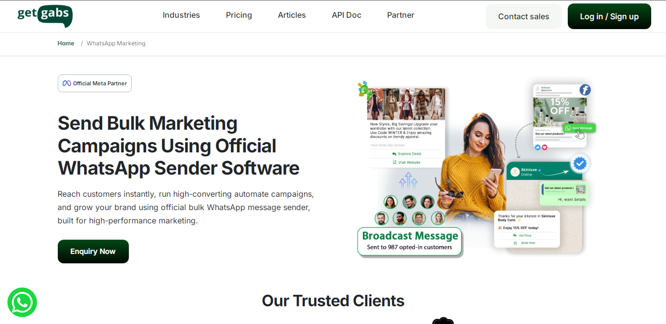 Getgabs is a well-known WhatsApp marketing tool designed to support businesses in connecting with their audiences at large scale. Being an official WhatsApp Business API partner, Getgabs allows users to send thousands of messages every month, with powerful automation features, managing a certain portion of workflow effortlessly. This is an all-in-one customer communication tool made for teams that require a reliable, centralized hub for WhatsApp-based customer outreach.
