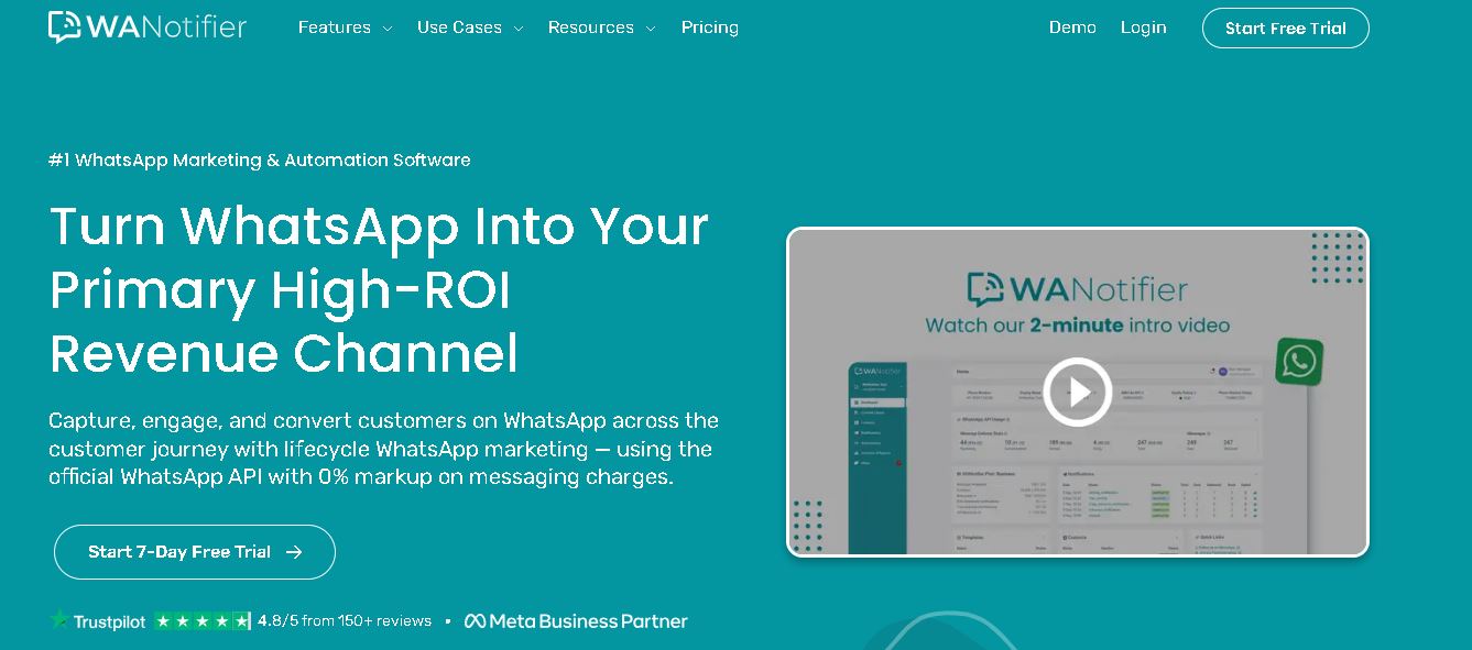 WANotifier is a WhatsApp marketing and automation platform built to help businesses manage the entire customer lifecycle on WhatsApp. This is from capturing leads to nurturing conversations and driving conversions. As an official Meta Tech Partner, WANotifier enables businesses to use the official WhatsApp Business API at 0% markup. This helps businesses significantly reduce messaging expenses while still accessing tools. With built-in CRM capabilities, powerful segmentation, and a no-code chatbot builder, WANotifier makes it easy for marketing and sales teams to scale personalized communication.